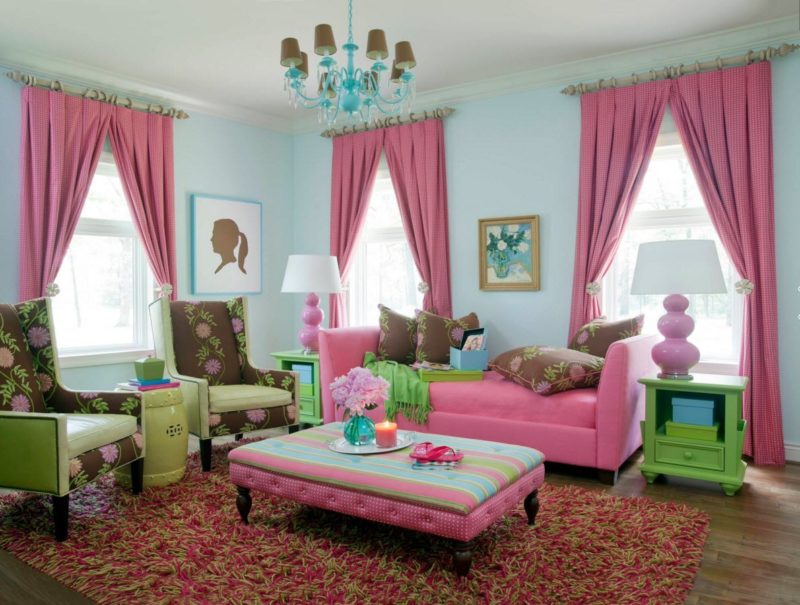 - гостиную. Можно выбирать контрастные оттенки и необычные сочетания. Чтобы не промахнуться, используйте готовые таблицы и ткани-компаньоны.