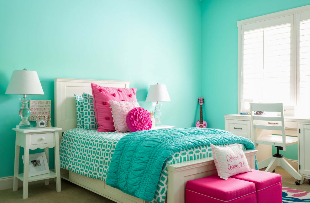Светло-бирюзовый уместен в роли основного, особенно в детской, спальне или ванной. Для кухни и гостиной подойдут и более яркие оттенки, причем как в роли основных, так и в качестве акцентов. Например, в интерьере отлично смотрятся аксессуары, текстиль и даже мебель бирюзового цвета.