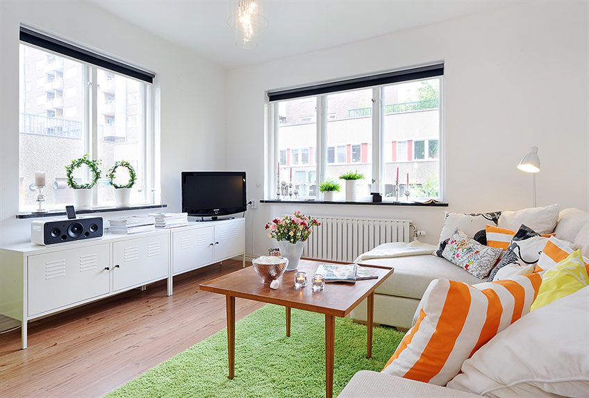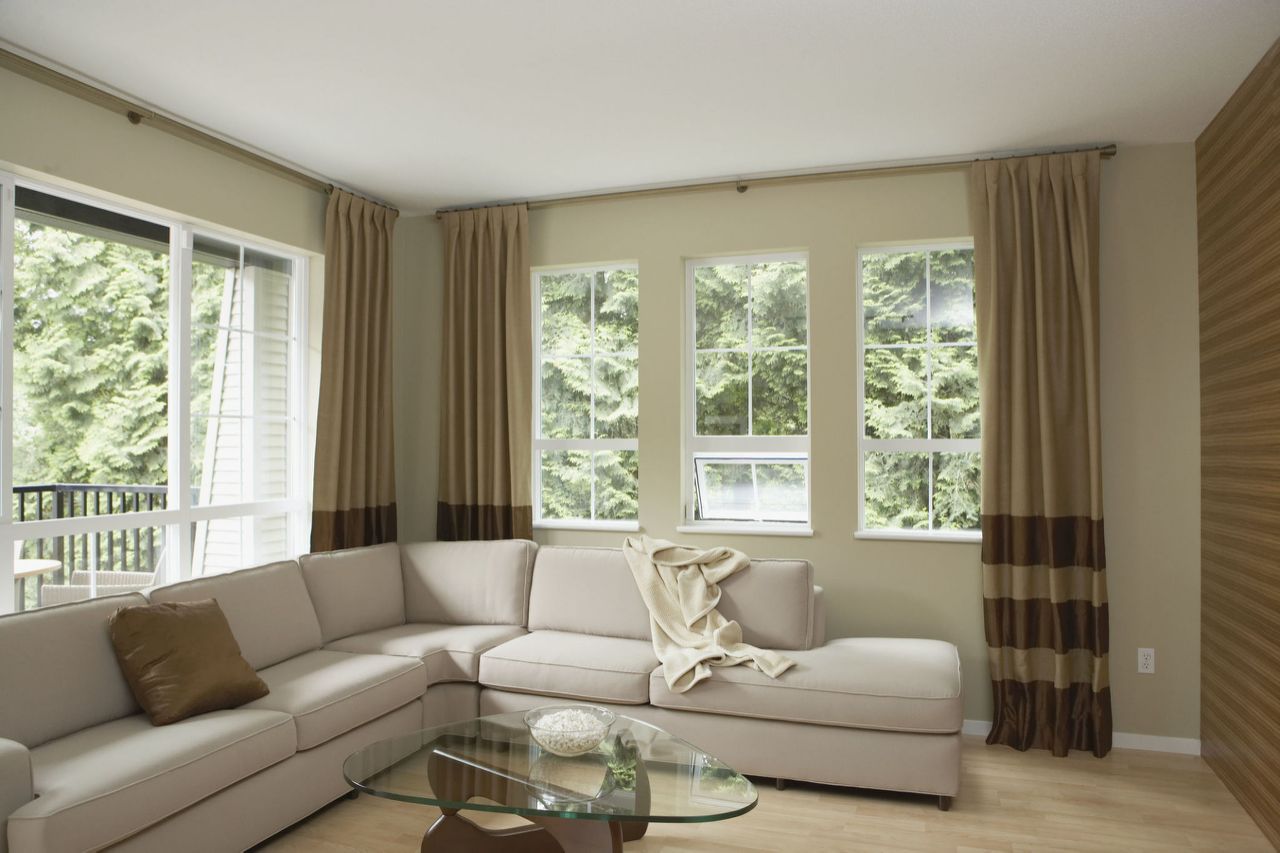 Возле окон, расположенных на соседних стенах, хорошо впишется угловой диван. Напротив него, на глухой стене, можно установить стенку с телевизором. Если комната большая, между диваном и окном лучше оставить проход. Если маленькая, поставьте мебель вплотную к окнам.