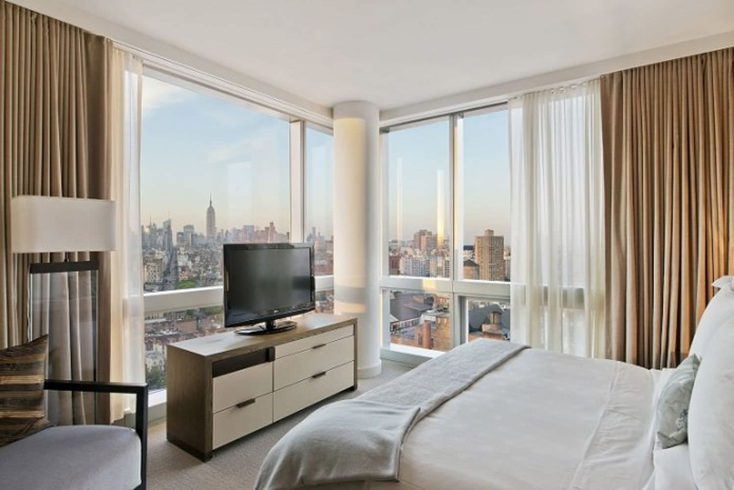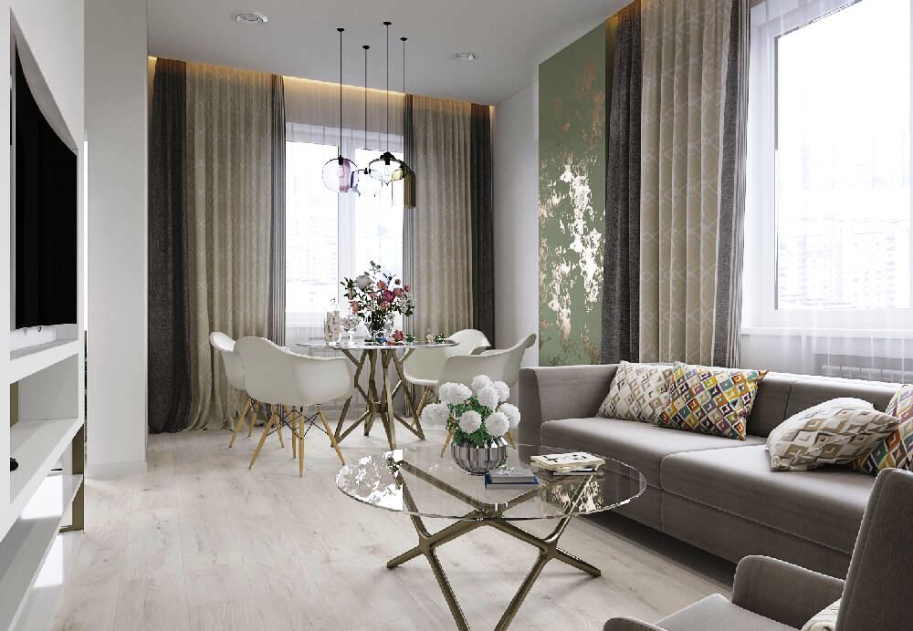 Если окна не примыкают к углу, а находятся на расстоянии друг от друга, пространство можно разделить на две маленькие комнаты с помощью стены, стеллажа или визуально. Например, отделить спальню от гостиной или зону отдыха от столовой.
