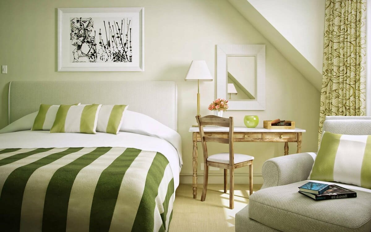 - З зеленим – природне, гармонійне поєднання. Для акценту використовуйте насичені відтінки зеленого від трав'яного до смарагдового. Зі світлими відтінками інтер'єр буде м'яким і заспокійливим.