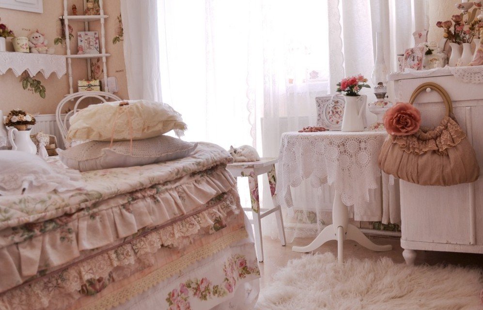 Ткани очень важны для шебби-шик. Выбирайте дорогой натуральный текстиль – шелк или лен со множеством драпировок. Отлично впишется в интерьер и отделка кружевом. Постельное белье или подушки, отороченные лентой кружева, ажурные салфеточки на полке, отделка на занавесках – достаточно нескольких деталей. Разбавляйте кружевные изделия другим фактурным текстилем – например, добавьте пару бархатных подушек или грубое вязаное покрывало.