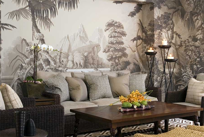 В монохроме отлично смотрятся изображения природы. Красивый пейзаж на всю стену создаст перспективу и глубину. Особенно, если рисунок становится менее активным от нижней части стены к верхней, а вверху остается свободное пространство. Визуально это приподнимает потолок и создает ощущение легкости.