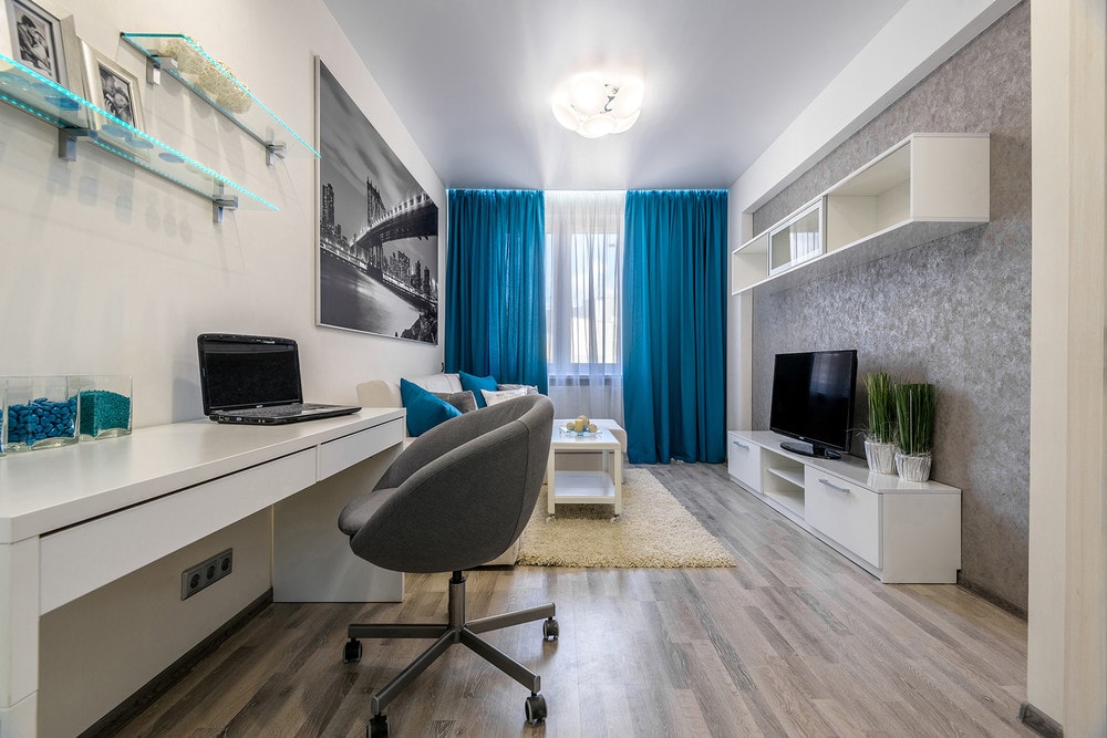Главное правило – не располагать мебель вдоль длинной стены. Кровати, диваны, шкафы – любые крупные элементы лучше ставить у торцевой стены. Например, если на ней расположено окно, поставьте рядом письменный стол. Также уравновесить пространство можно, поставив у торцевой стены гардероб или книжный шкаф. За счет этого свободное пространство будет напоминать квадрат и выглядеть гармоничнее.