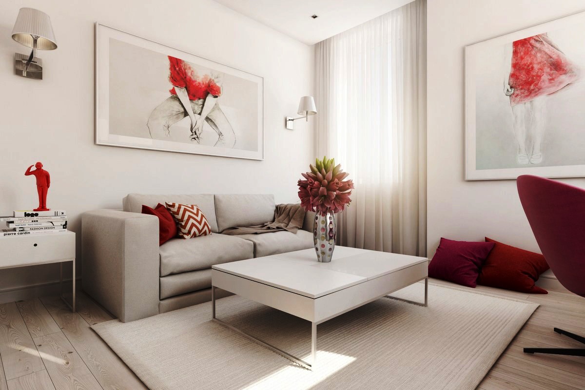 Такие комбинации оживляют нейтральность серых и бежевых оттенков, добавляют жизнерадостности и тепла. Если говорить о розовом, это может быть пудровый, светло-коралловый, персиковый. Из красных оттенков подойдет ализариновый, терракота и не слишком яркие коричневато-красные тона.