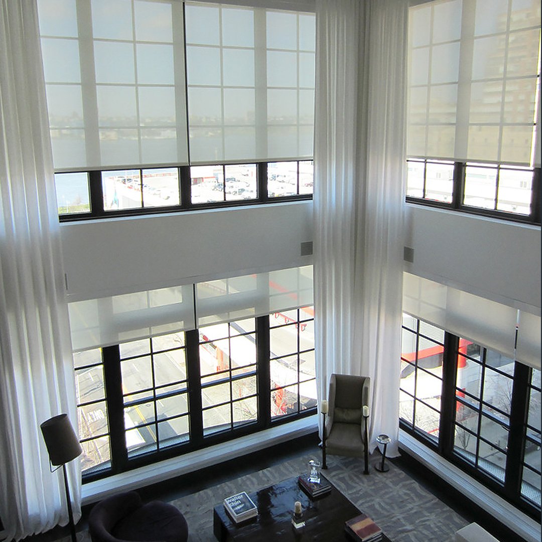 Шторы на высоких окнах, под потолком, физически сложно двигать вручную. Если предполагается рулонная штора, учитывайте, что на высоком окне свернутый рулон ткани будет очень объемным. Поэтому есть риск неравномерного сворачивания