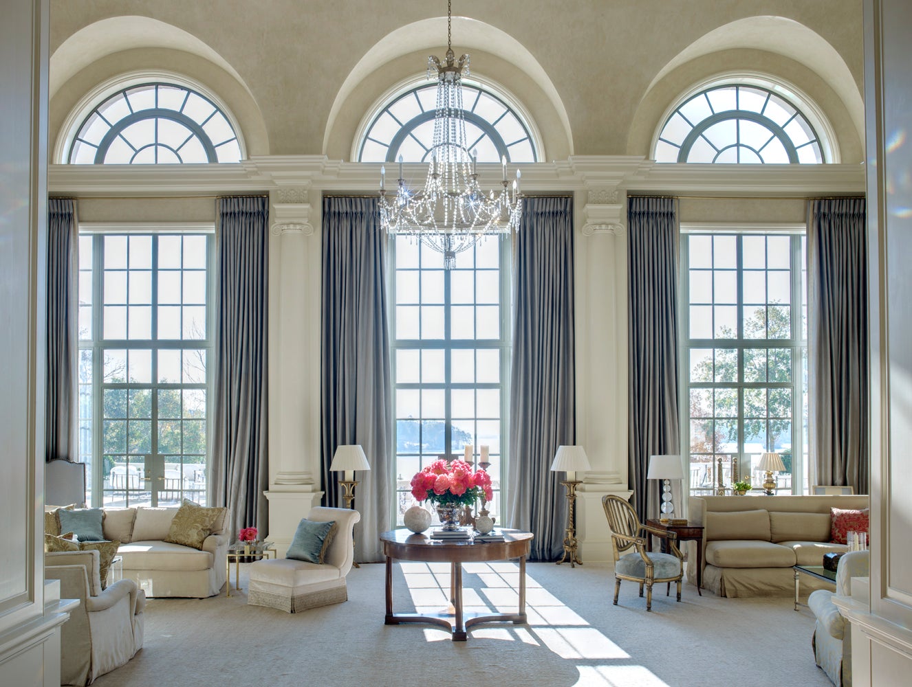 Высокие окна делают комнату воздушнее, светлее, легче. А еще дают безграничное пространство для фантазии. Но оформить их шторами не так просто, особенно, если потолки выше 4 м. Рассказываем, как выбрать шторы для высоких окон, какие трудности могут возникнуть и как их обойти.