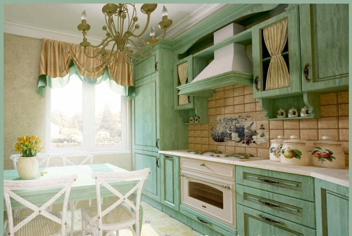 Для отделки стен используется светлая краска. Но можно подобрать и обои в стиле прованс, с цветочным дизайном. Пол – дощатый, окрашенный. Как вариант, подойдет ламинат под дерево или керамическая плитка для кухни.
