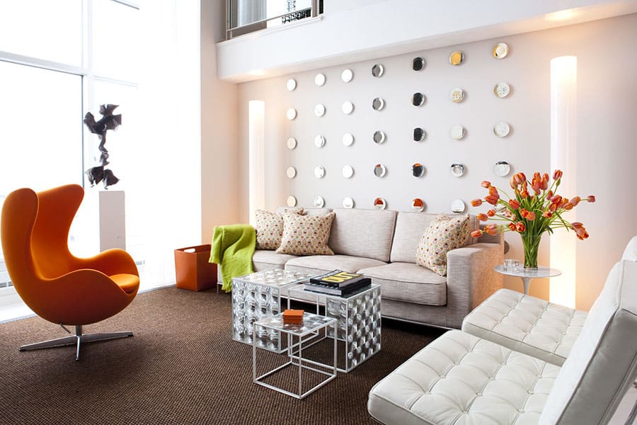 Нейтральні і яскраві відтінки розміщуйте в інтер'єрі в пропорції 80 до 20. 80% інтер'єру – нейтральні, а ще 20% – яскраві. Причому під нейтральними слід розуміти фонові ахроматичні відтінки (білий, сірий, пісочний, чорний).