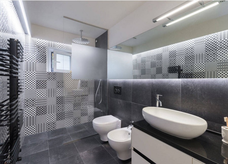 - Якщо збираєтеся використовувати керамічну плитку, вибирайте квадратну з незвичайним малюнком – саме такі моделі зараз найактуальніші. Чіткої послідовності візерунка дотримуватися не обов'язково. Викладіть її в довільному порядку і станьте власником унікальної ванної кімнати.