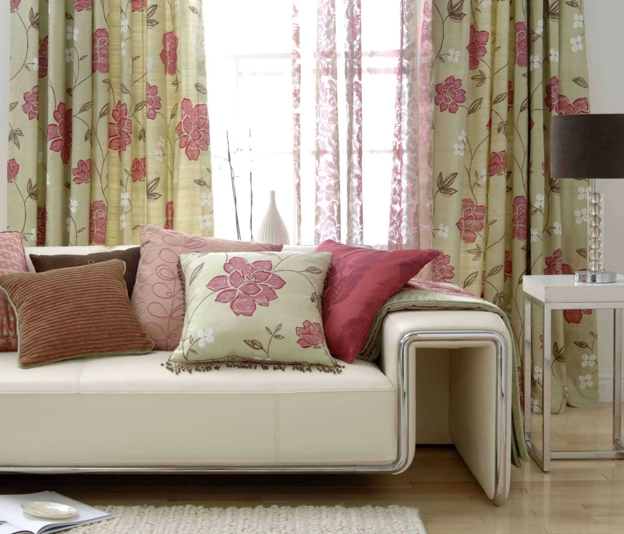 Яркие красивые шторы могут играть роль цветового акцента. Например, если в комнату нужно ввести дополнительный оттенок, но его не должно быть слишком много. В таком случае лучше оставить саму штору светлой, но с рисунком того же цвета, что и подушки.