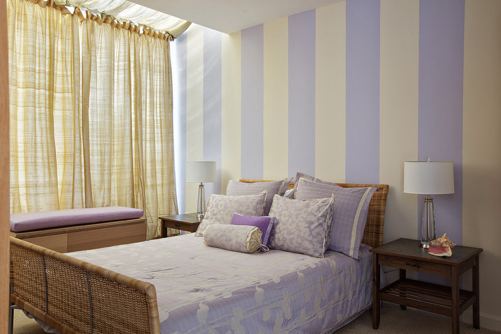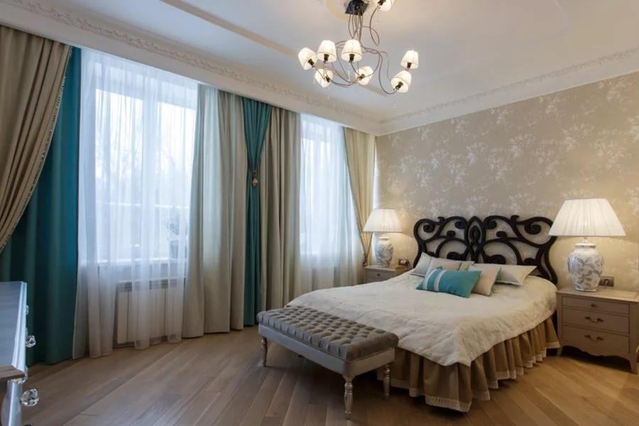 - если стена оформлена в двух цветах, для штор можно использовать один из них или же выбрать другой оттенок, но в той же цветовой гамме
