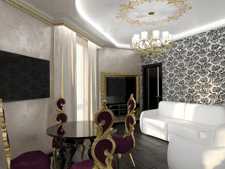Для классического интерьера подойдет венецианская штукатурка светлых оттенков – белая, кремовая, золотисто-бежевая. С ее помощью можно воссоздать вид натурального камня, вкраплений драгоценных металлов или самоцветов. Еще один вариант – шелковая, которая создает эффект мягкой поверхности с приятным перламутровым свечением.