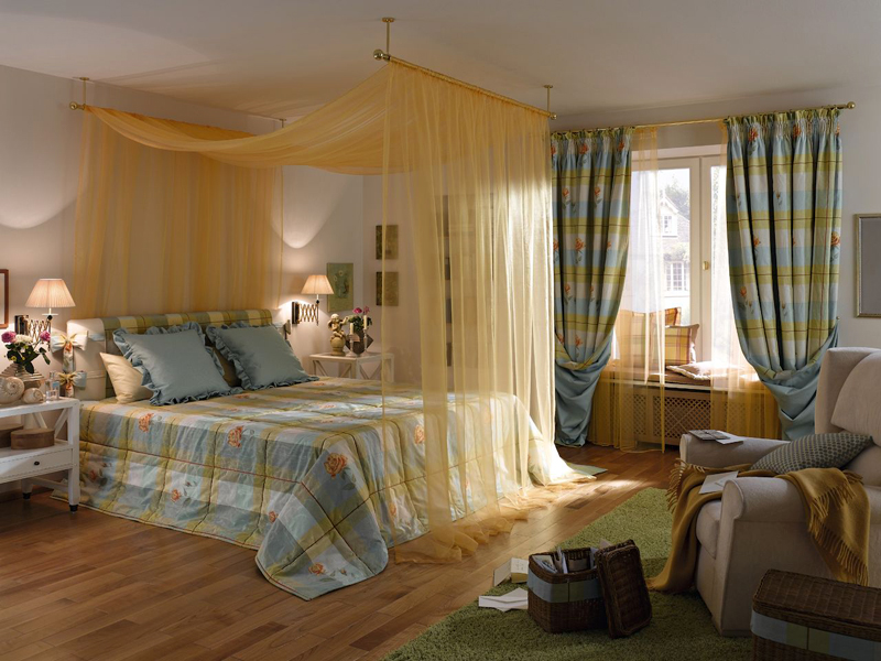 Отличный способ сделать спальню уютной, чувственной и красивой. Просто подвесьте к потолку кольцо или установите карнизы, чтобы закрепить отрезы ткани. Материал может быть легким или плотным на ваш выбор, главное, чтобы он хорошо драпировался.