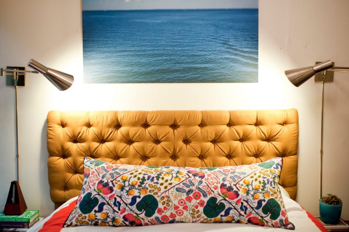 Еще одна вдохновляющая идея для спальни. Подберите для изголовья ткань, подходящую к общему оформлению спальни, например, к шторам или ковру. Самый простой способ – использовать ткани-компаньоны из одной коллекции.