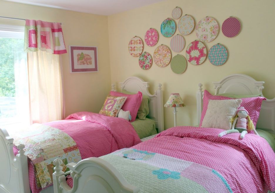 Текстильные панно отлично смотрятся на однотонных светлых стенах. А сделать их очень легко. Просто выберите подходящие отрезы ткани и натяните их в рамки или пяльцы для вышивания разного диаметра. Кстати это хороший вариант, если у вас осталась ткань после пошива штор или диванных подушек.