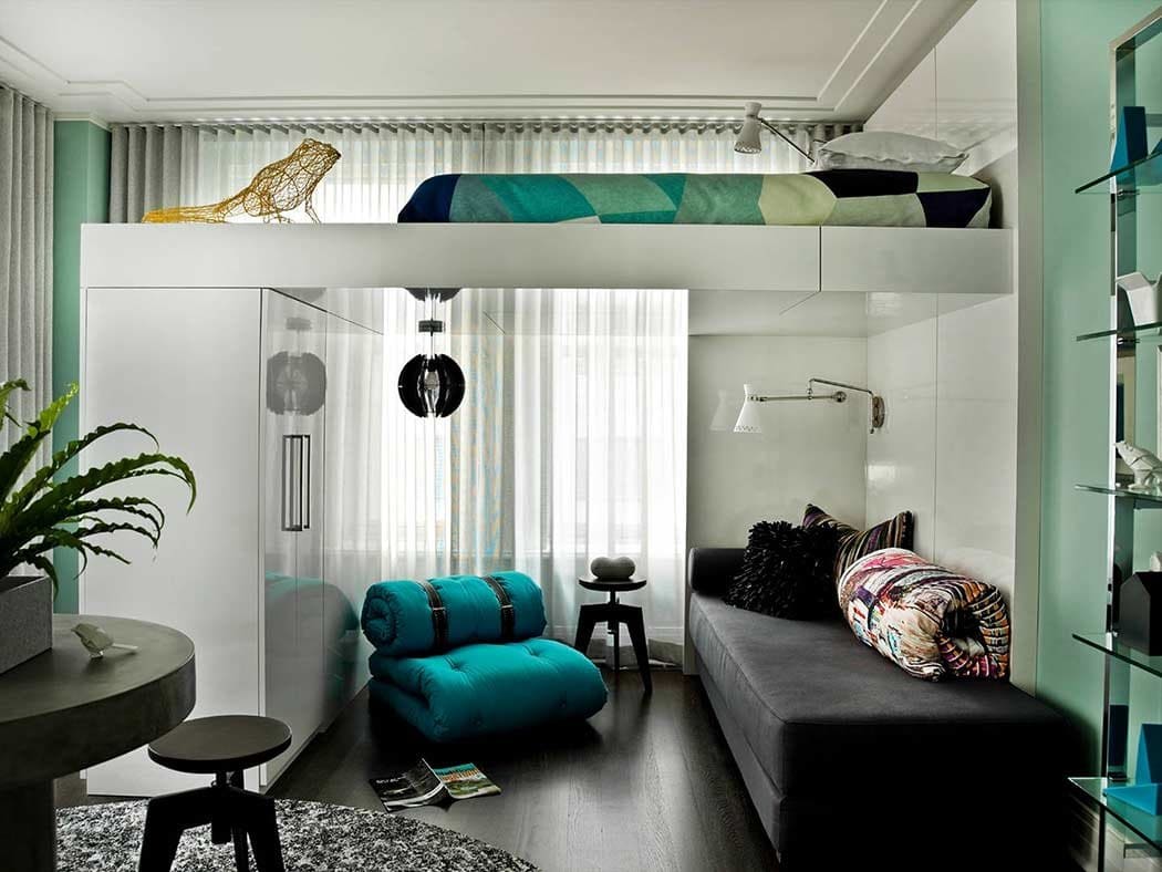 Якщо стеля досить висока, можна створити імпровізований другий поверх і обладнати на ньому місце для сну, а під ним – робоче місце. Якщо висота стель не дозволяє втілити таку ідею, ви можете повісити над дверима невелику шафу або пару полиць для зберігання потрібних дрібниць.