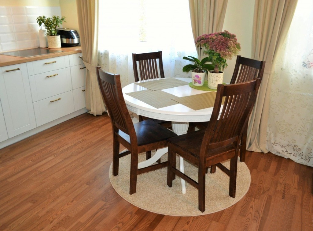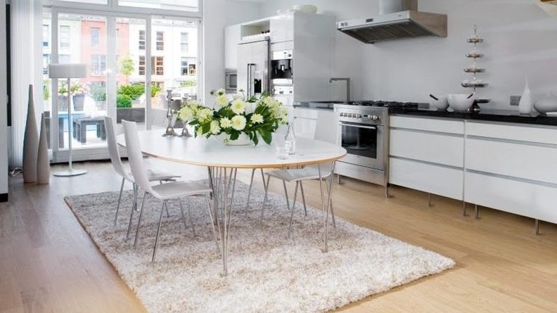 Если выбираете ковер для обеденной зоны, то он должен быть хотя бы на 60 см больше мебельной группы. Так вы сможете свободно выдвигать стулья, не цепляясь за край ковра. Если стол круглый, то ковер может быть и небольшим – чтобы выдвинутые стулья стояли на нем только передними ножками.